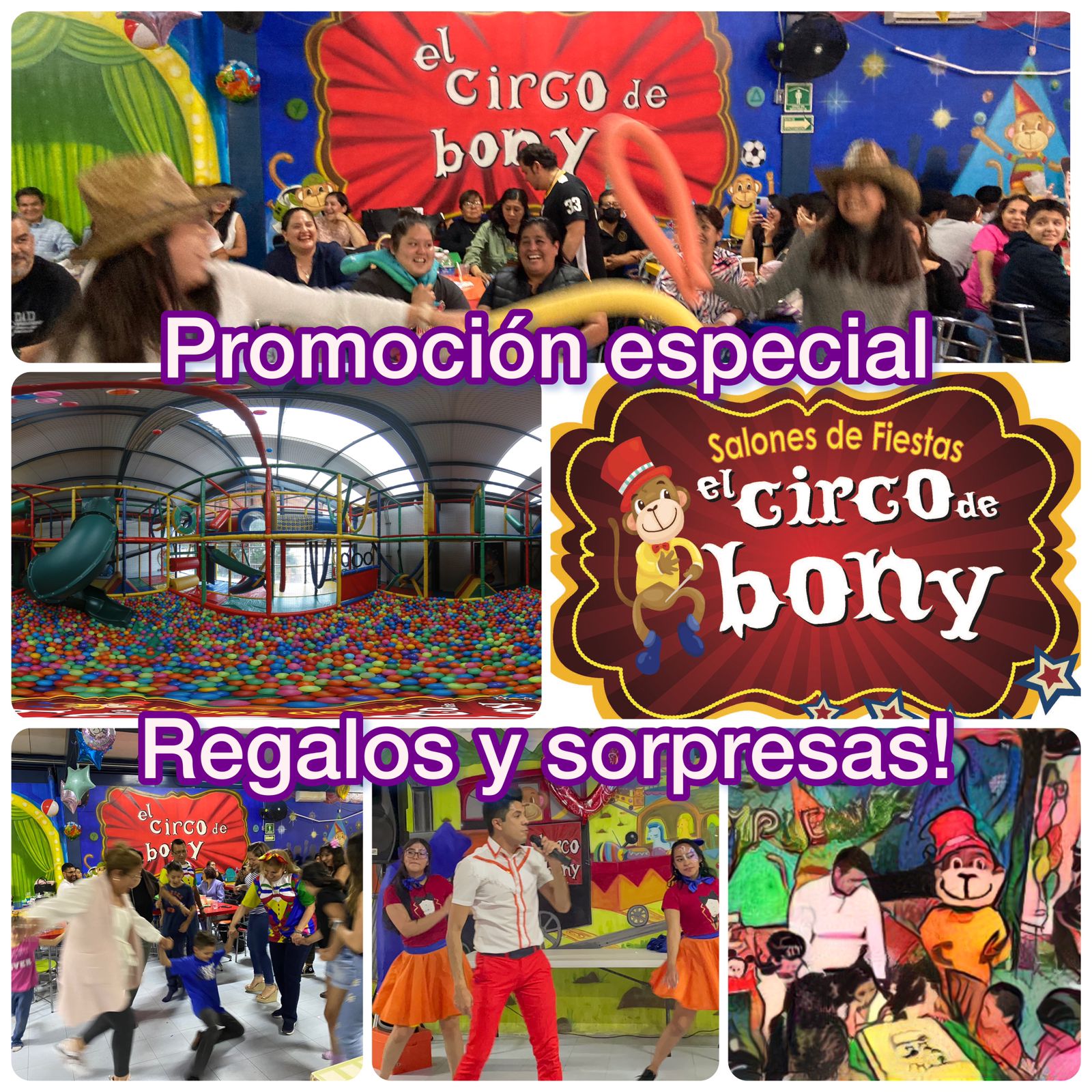 Amigos! El Circo de Bony quiere celebrarles su fiesta con una promoción especial . (Vig. Limitada) Cumpleaños Infantiles! Eventos infantiles con paquetes todo incluido. Renta de salón, paquetes de alimentos, show’s y animadores temáticos y organización con staff especializado. Mega Laberinto: Zona de juegos: Mini Zona Servicios de Comida Para mayor información de nuestros servicios te invitamos a visitar nuestras redes sociales, sitio web ó comunicarte con nosotros directamente a nuestro Whatsapp. Si quieres ver nuestra Ficha de Google Clic Aquí